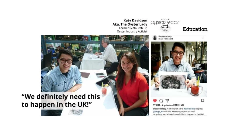 ‘Katy, Thanks to your help from The Oyster Academy, I have successfully passed my exam! Your valuable knowledge on the Oyster industry gave me all the material I need to develop a relevant system, also helped me defend my design approach during the Q&A sessions in the final exam. I have decided to develop a shell collection service for the UK context, something that the Oyster restoration system is most needed. The service is in the form equipped with a vehicle functioning both as oyster shell collection service and oyster bar food truck. Collecting shells and educating the public at the same time.’